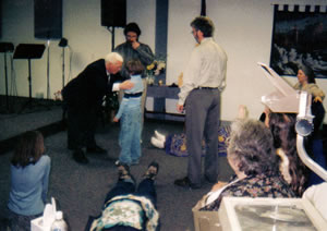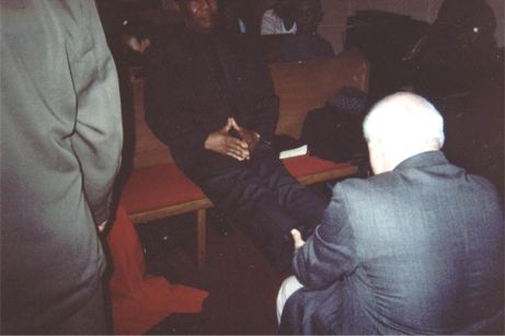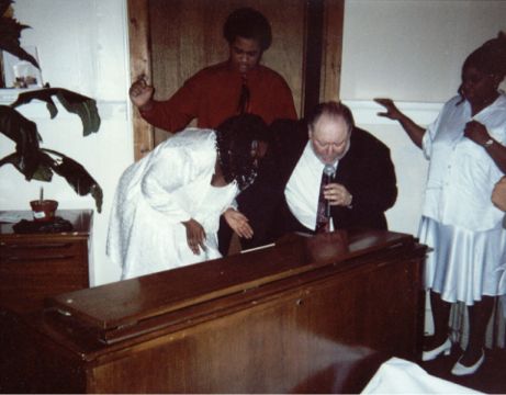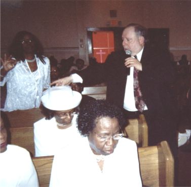 Minister Bull moving in the Spirit as he is praying after speaking in Peru, NY. Minister Bull has a special anointing in praying for people with back, neck and leg situations. God works mighty healings through Him. When he gets the chance, he travels with Rev. Cohen (to assist him in his meetings.)