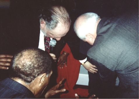 Rev. Cohen, Pastor Sneed and Minister Jerry pray for a man whose both knees had given him pain. After praying, there was no more pain.! Praise God!